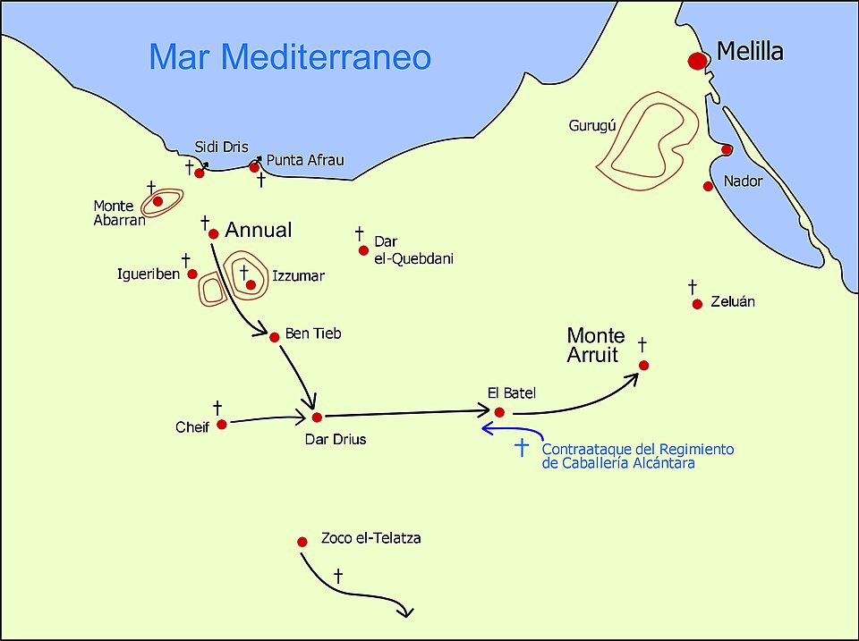 Les tropes dels generals Silvestre i Berenguer van avançar des de Melilla sense oposició apreciable. No es van enfortir les posicions i amb una línia de subministrament feble fins a Annual, on el 22 de juliol, després de la caiguda d’Igueriben, els indígenes de la policia espanyola van desertar, disparant a traïció i escampant el caos a Annual i en efecte dominó a la resta de posicions. Silvestre va ordenar la retirada cap a Dar Drius i va desaparèixer. Això va derivar en caos, milers de morts i la pèrdua de 20.000 fusells, 400 metralladores i 129 canons i el territori conquerit en el Rif.