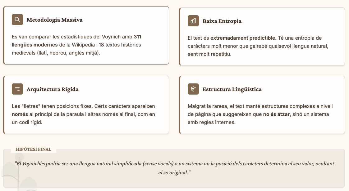 L'estudi revela que el Voynich té una entropia de caràcters inusualment baixa. Això significa que és extremadament predictible: les lletres es combinen seguint regles molt més rígides que en qualsevol llengua natural coneguda (com el català o el llatí).